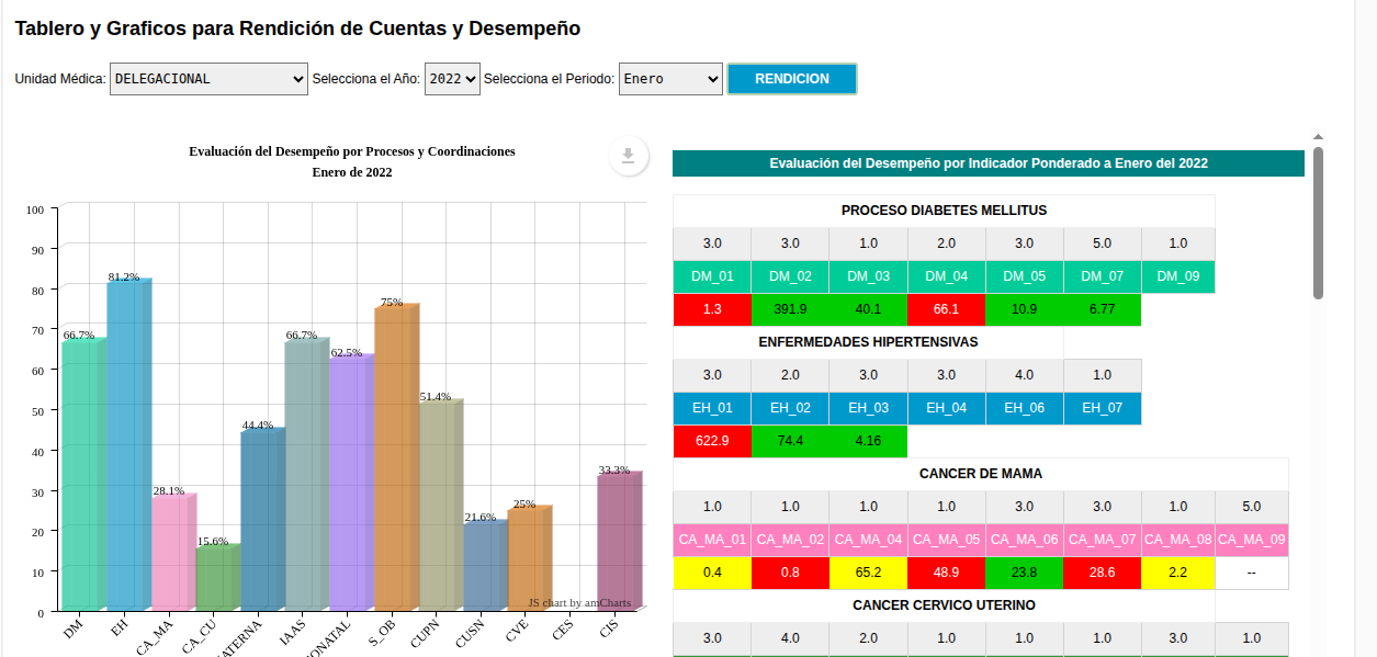 Se diseño este sitio web para ayudar con la evaluación del desempeño de las unidades medicas respecto a los indicadores medicos designados por la institucion publica. Contiene tableros dinamicos utilizando PHP, JavaScript, AJAX, SQL, CSS y HTML.